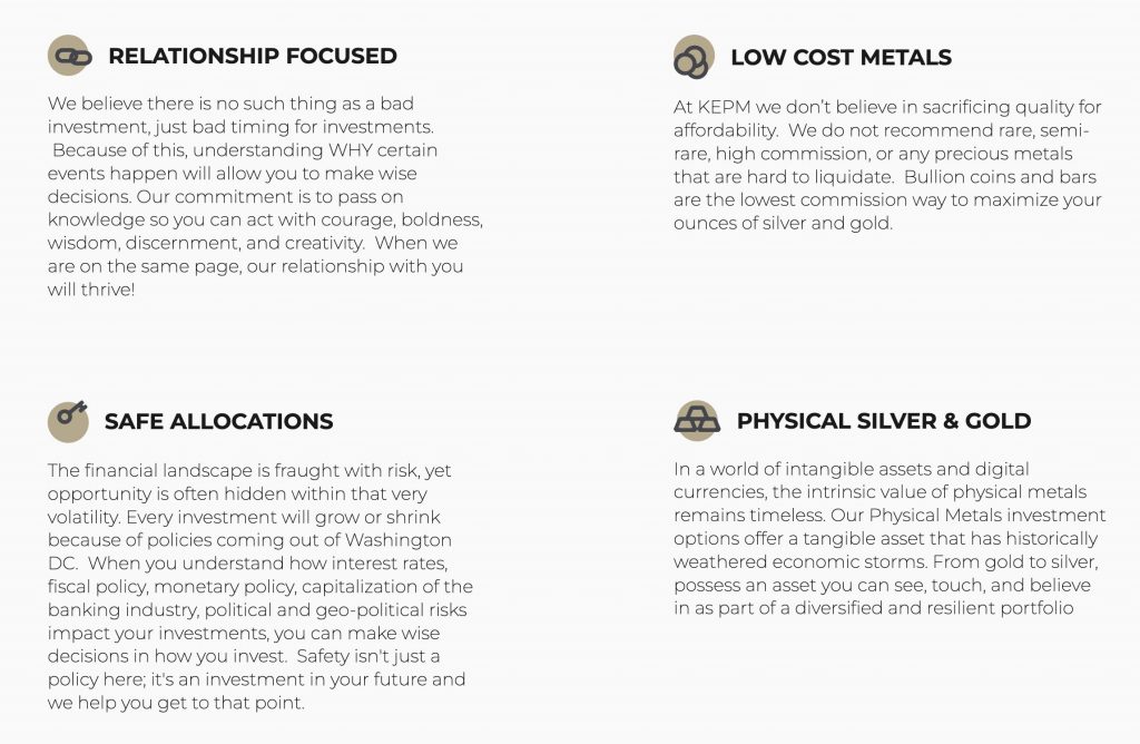 Choose KEPM if: You value educational support, faith-based values, and relationship-focused service. The company’s strengths align well with investors who appreciate Dr. Elliott’s economic commentary and want ongoing guidance.
