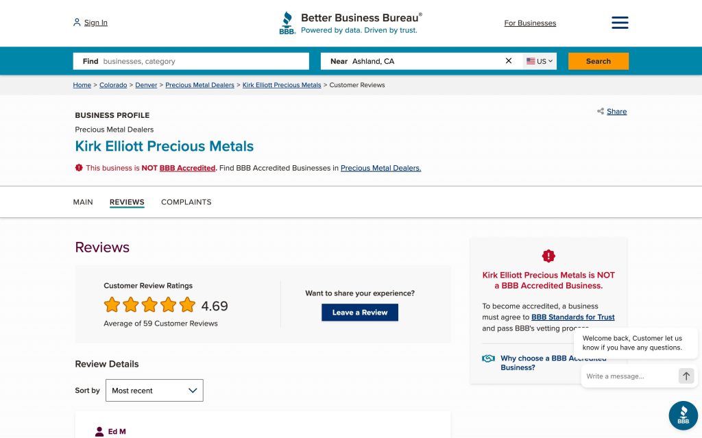 - Better Business Bureau Business Profile, BBB Great West + Pacific, 2024, https://www.bbb.org/us/co/denver/profile/precious-metal-dealers/kirk-elliott-precious-metals-1296-1000165144